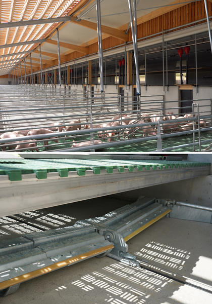 The PigPort 3 stable has been equipped with faeces-urine separation in the underfloor channels – a measure that reduces ammonia and odour emissions by around 50%. Thanks to its installation on a slope, the soil also acts as insulation: in summer, the lying area remains cool, while in winter it stays at a pleasant temperature.