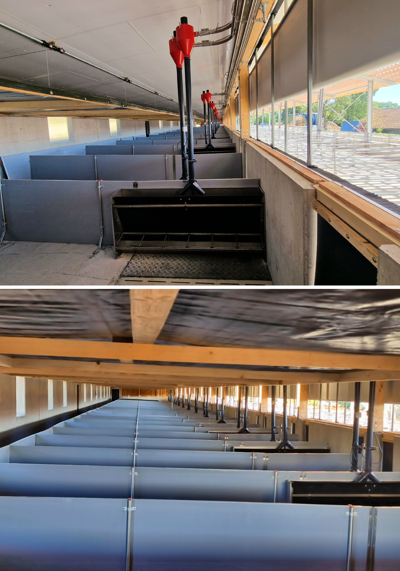 The lying area is equipped with heated boxes and underfloor heating, supplemented by thermal covers for the pre-fattening area. The thermally insulated roll-up tarpaulin provides flexible ventilation in summer and protection in winter.
