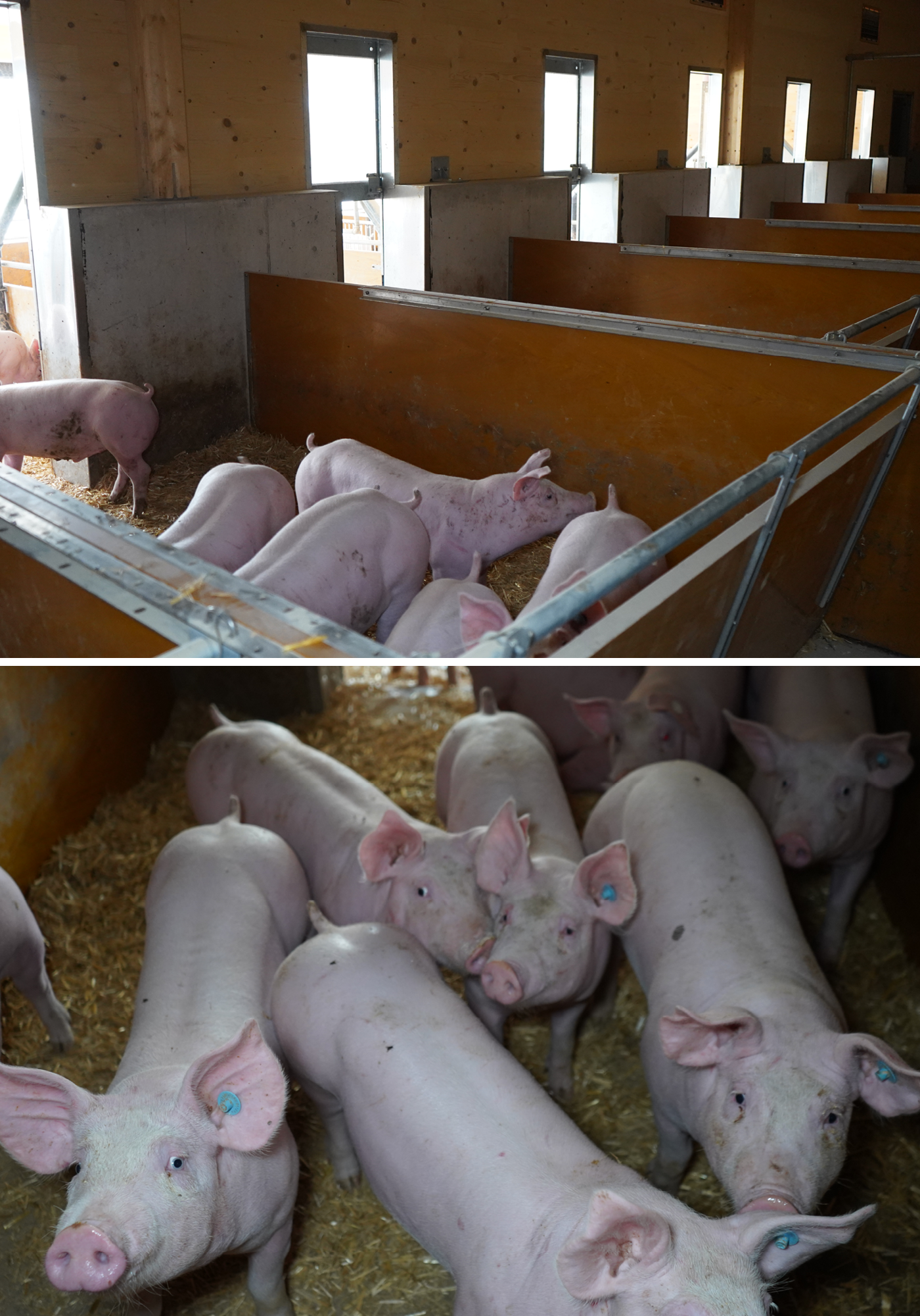 The barn is divided into two functional areas: a warm lying area and a cooler feeding and manure area. This separation ensures natural behaviour control of the animals and contributes to a hygienic environment. The lying area is littered with straw and offers the pigs a comfortable and animal-friendly resting area.